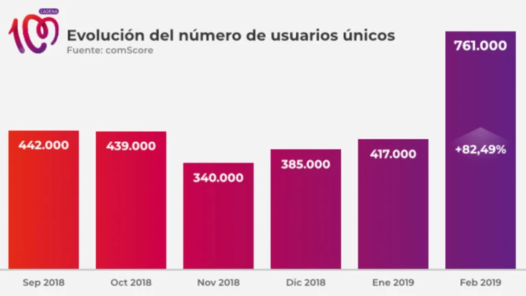 CADENA100.es se dispara en audiencia. En su primer mes desde el lanzamiento de la nueva web y el inicio de su transformación digital, nuestra web crece de forma vertiginosa y ya supera a casi todos sus competidores directos. Según datos de comScore, medidor de referencia de las audiencias digitales, 761.000 personas diferentes visitaron CADENA100.es durante el mes de febrero. Este dato es un 82,49% mayor que el mes anterior y un 112,56% con respecto a febrero de 2018.