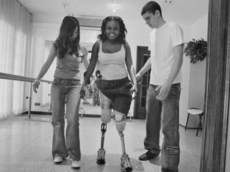 Sofía Elface Fumo, víctima de una mina, prueba sus nuevas prótesis en el Institut Desvern de Barcelona en mayo de 2005.