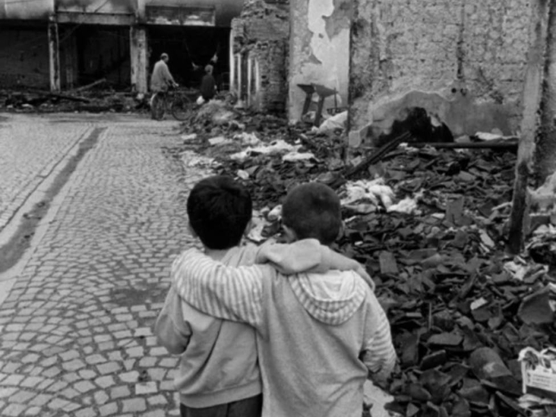 Dos niños pasean abrazados entre las ruinas. Djakova (Kosovo), junio de 1999.